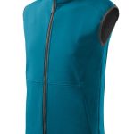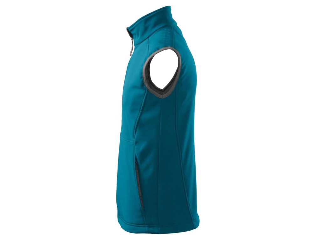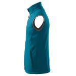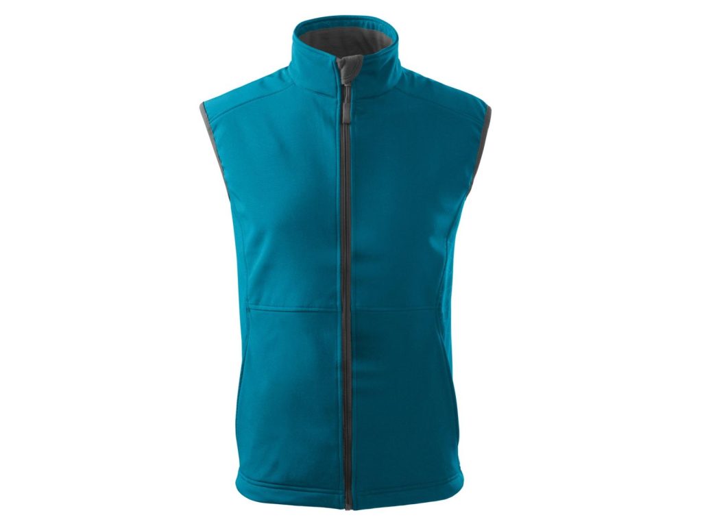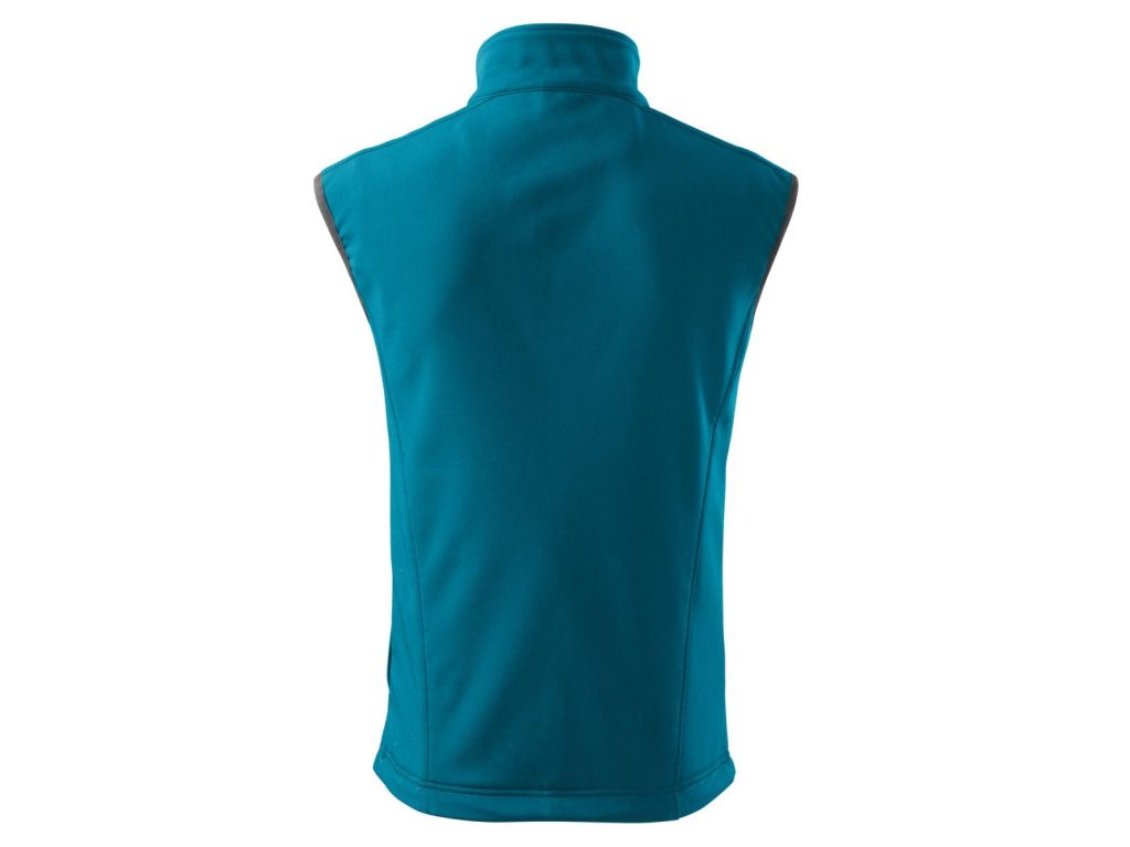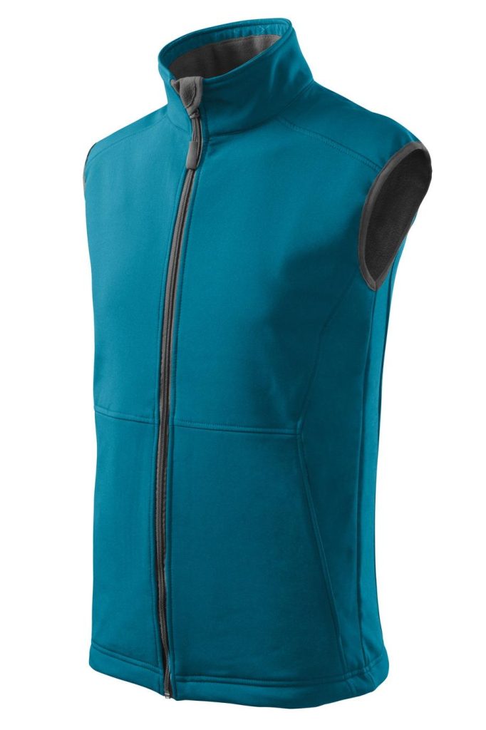 Softshellová pánská vesta tm. tyrkys z 2vrstvého softshellu má lehce vypasovaný střih, vnitřní fleece s antipilingovou úpravou, kontrastními prvky, celopropínacím spirálovým zipem s krytkou brady, v dolním lemu lze stáhnout elastickou šňůrkou, kapsy na zip skryté v členících švech. Materiál: Softshell – 94% polyester, 6% elastan, Fleece – 100% polyester 280g/m2. Praní: na 30°C.