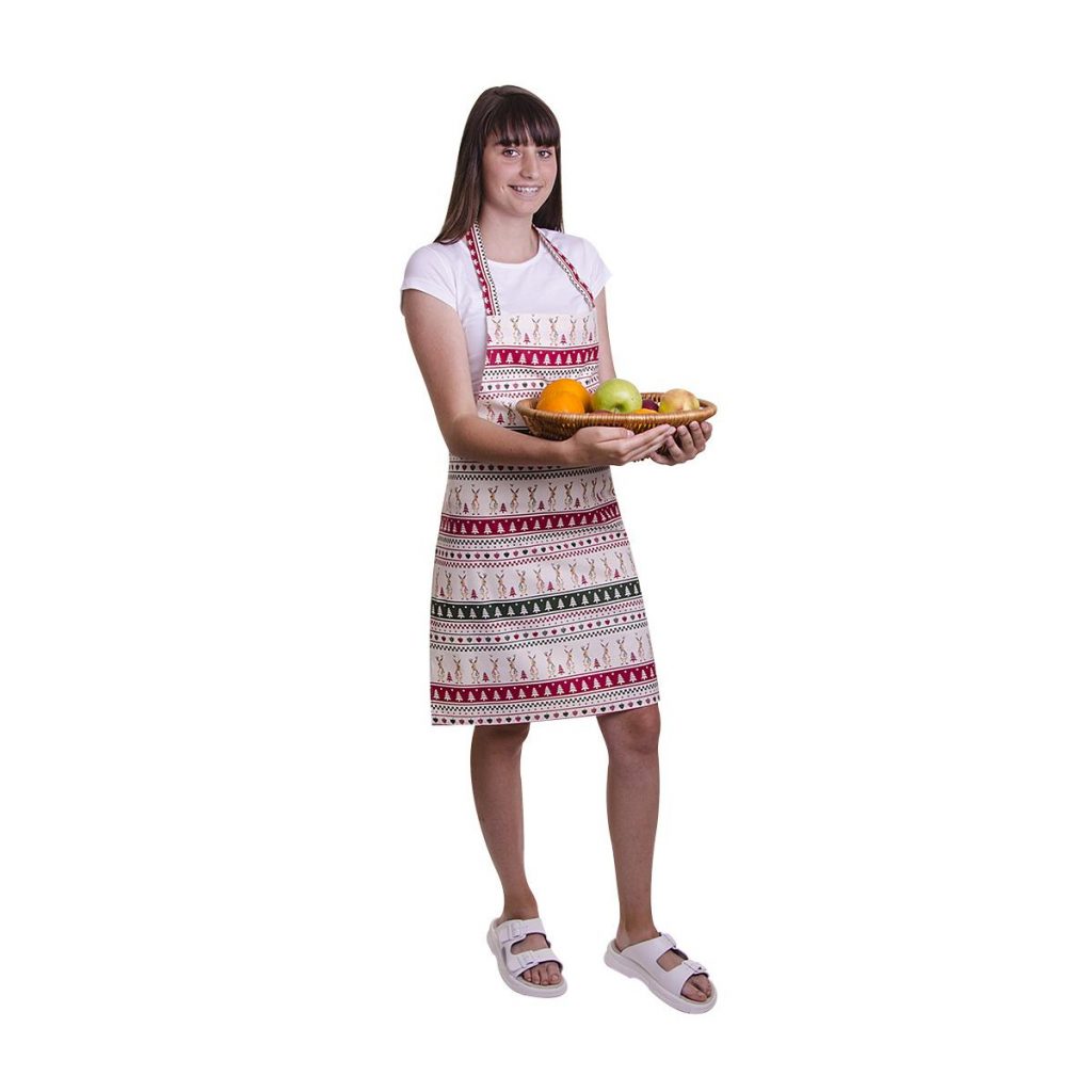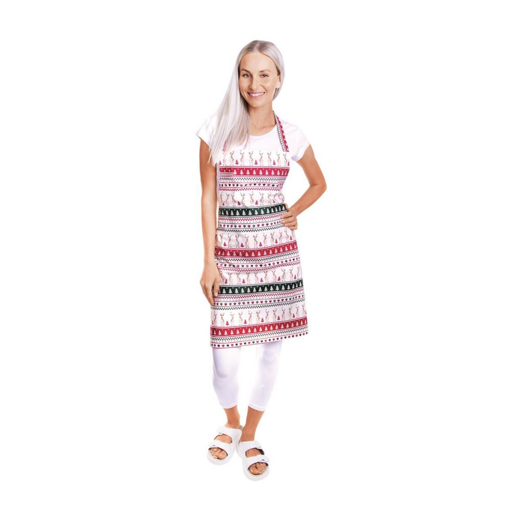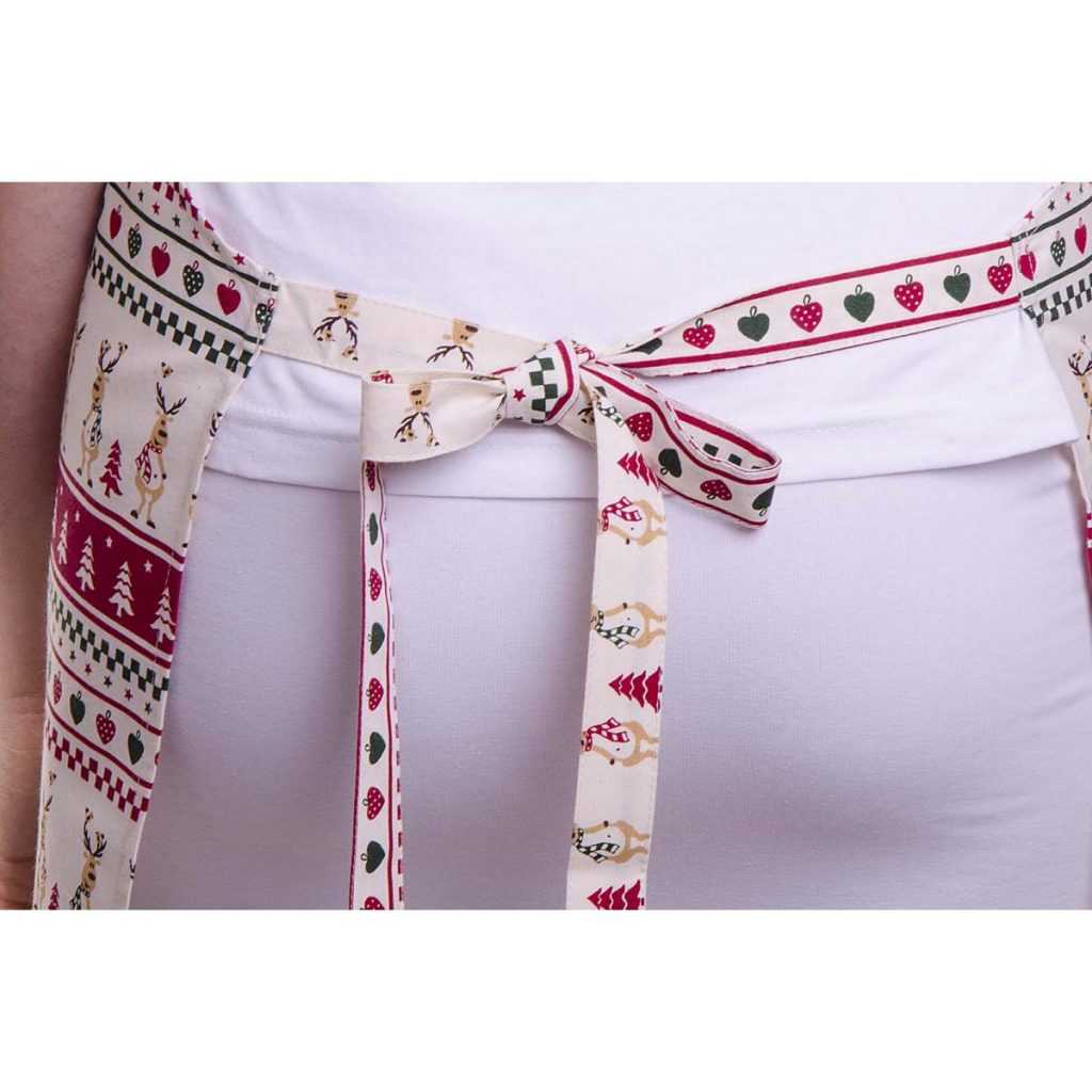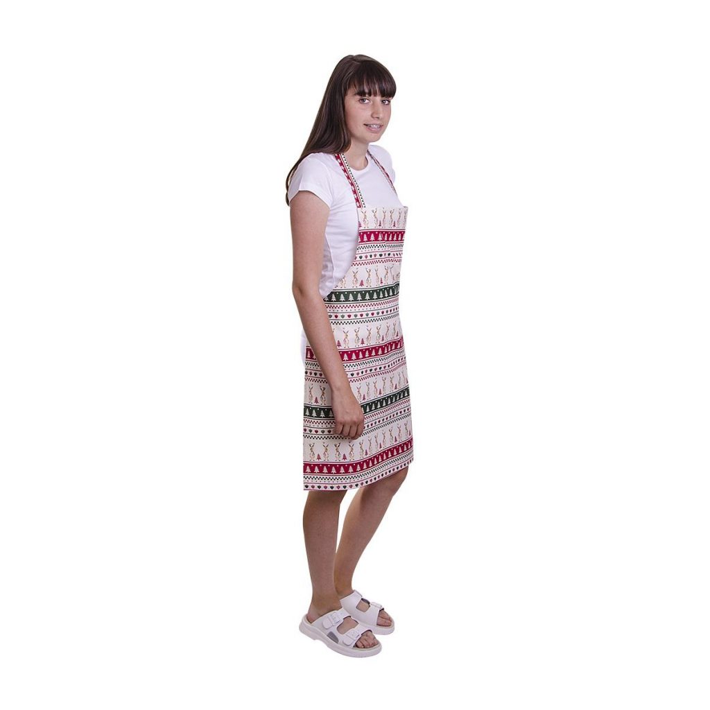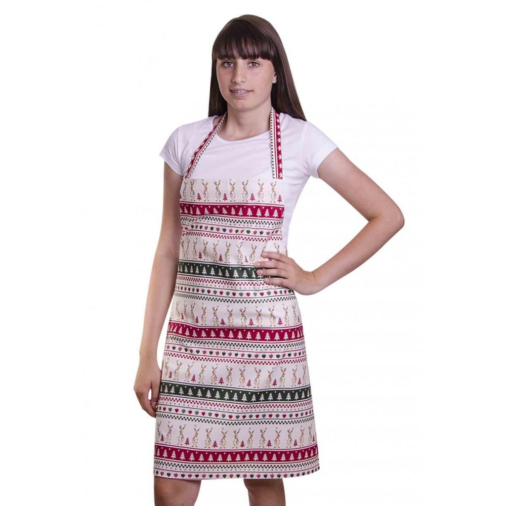 Stylová zástěra se vzorem vánočních sobů s laclem a praktickým zavazováním vzadu. Materiál: 100% bavlna, 150g/m2. Rozměry: 65cm šířka, 68cm délka (výška).