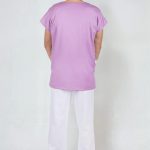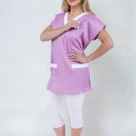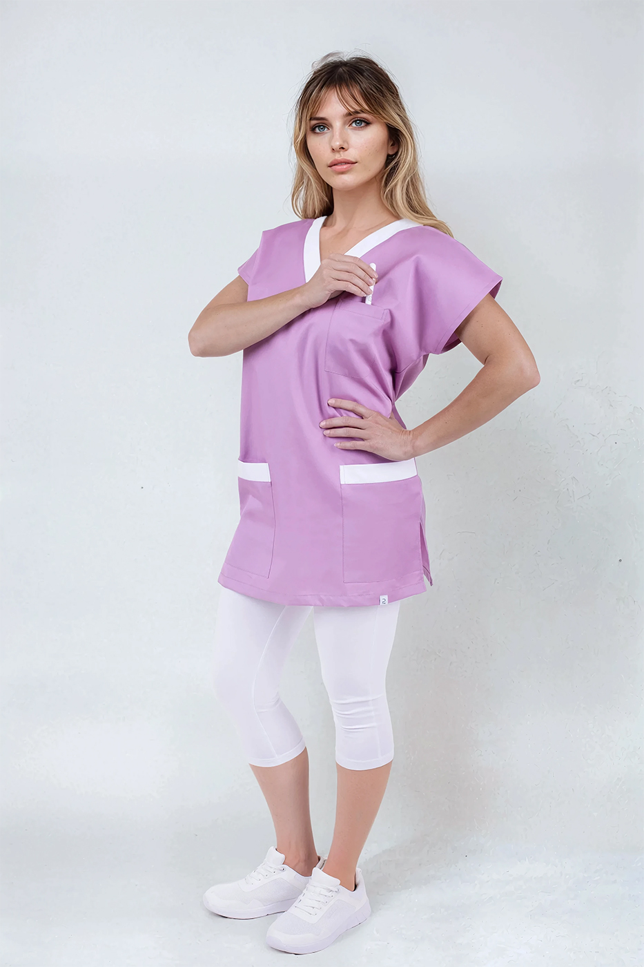 Zdravotní halena pro zdravotníky Unima 1 fialová/bílá, oblékání přes hlavu, s výstřihem do V, boční rozparky, 3 praktické kapsy.