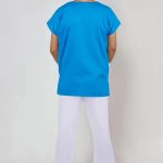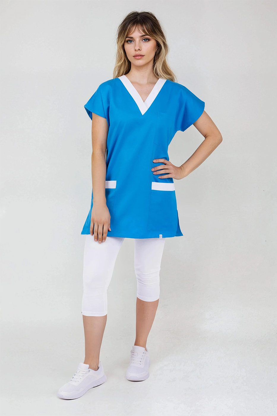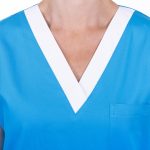 Zdravotní haleny pro zdravotníky Unima 1 tyrkys/bílá, oblékání přes hlavu, s výstřihem do V, boční rozparky, 3 praktické kapsy,
