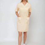 Výstřih ve tvaru V dodává šatům decentní ženský vzhled a zároveň poskytuje volnost při pohybu. Šaty mají dvě praktické spodní kapsy, kam lze pohodlně uložit drobnosti, jako jsou poznámkové bloky, tužky, dezinfekční gel nebo mobilní telefon.