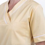 Žlutá barva šatů Julia-B nepůsobí rušivě, ale naopak přináší do zdravotnického prostředí pozitivní a přátelskou energii. Jemný pastelový tón v kombinaci s bílým lemováním působí čistě, svěže a profesionálně. Zdravotní šaty tak nejen zvyšují pohodlí nositele, ale přispívají také k příjemné atmosféře na pracovišti, což má pozitivní dopad na pacienty i kolegy.