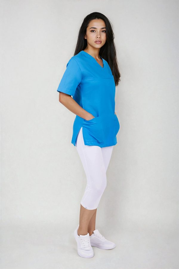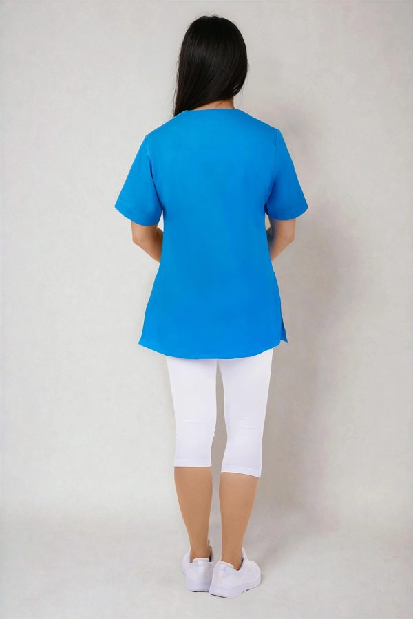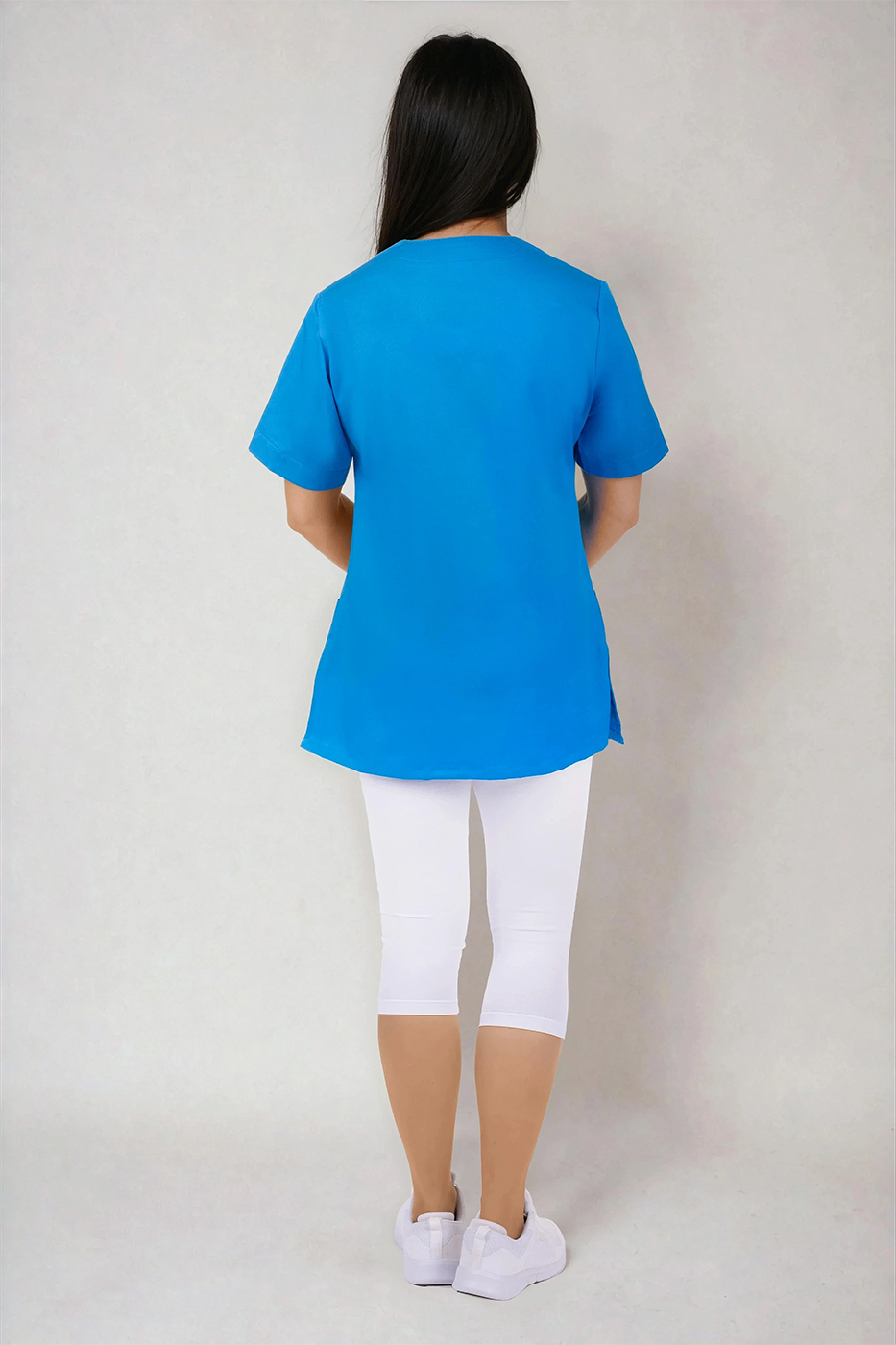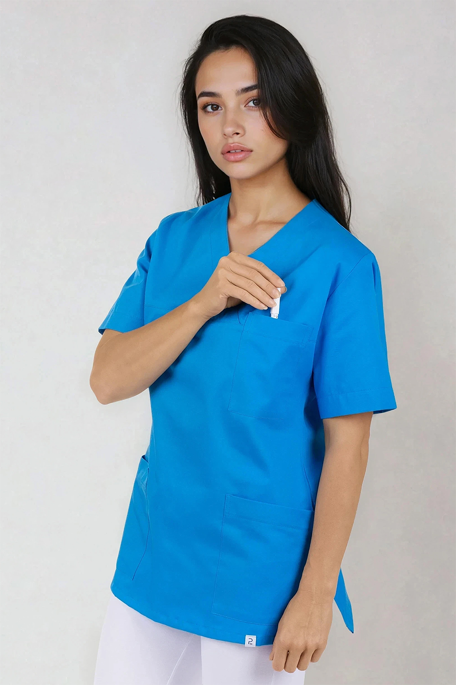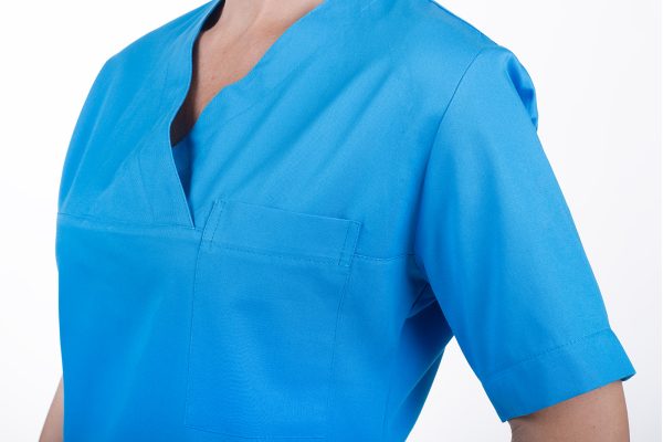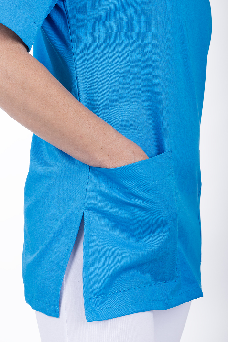 Oblékání přes hlavu je praktické, rychlé a usnadňuje přechody mezi jednotlivými činnostmi. Výstřih do V působí vzdušně, lichotivě a zároveň napomáhá ventilaci – což oceníte zejména v teplejších měsících nebo v provozech s vyšší teplotou.