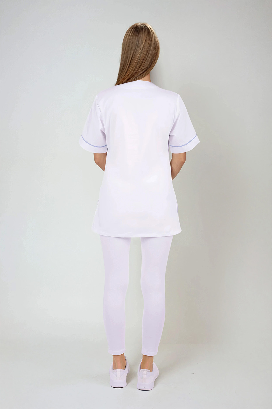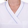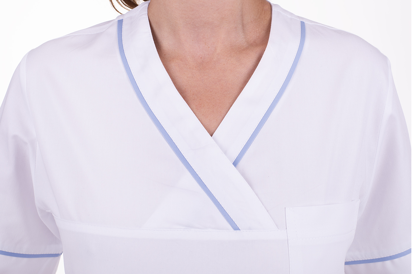 Barevné zdobení na rukávech a výstřihu haleny Julia-B dodává jinak jednoduchému modelu příjemný vizuální detail. Tento designový prvek potěší všechny ženy, které chtějí v pracovním oblečení působit upraveně a stylově. Zadní díl haleny je hladký a dolní kraj rovný, doplněný o krátké boční rozparky, které podporují volný pohyb a pohodlí při sezení, chůzi i sklánění se k pacientům.