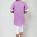 Zdravotnická halena dámská Paris fialová má pohodlný rovný střih, krátké rukávy, průkrčník začištěný stojáčkem, na předním díle 3 nakládané kapsy, zadní díl je hladký a dolní kraj rovný s krátkými bočními rozparky.