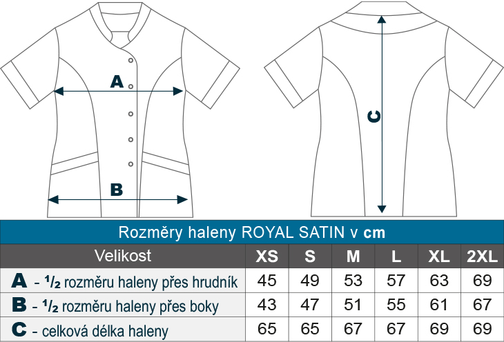 Neváhejte a dopřejte si pracovní oděv, ve kterém se budete cítit pohodlně, vypadat reprezentativně a zároveň plnit náročné hygienické požadavky. Zdravotnická halena dámská Royal Satin je spojení elegance, komfortu a praktičnosti – ať už pracujete v nemocnici, salonu nebo ordinaci. Navštivte náš e-shop a vyberte si svou velikost i barvu. Kvalita a česká výroba mluví za vše!
