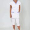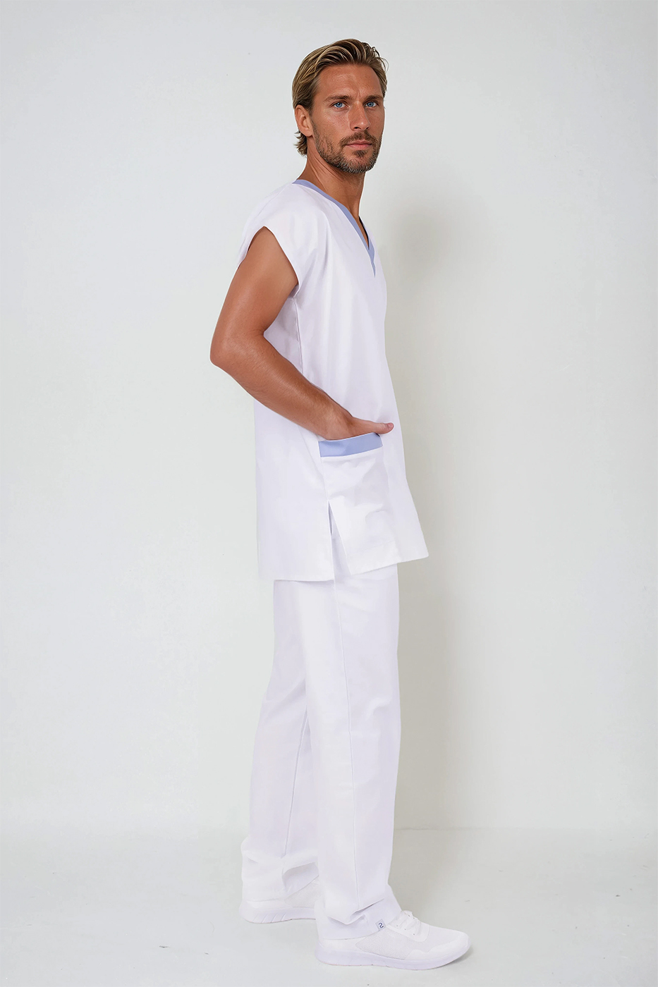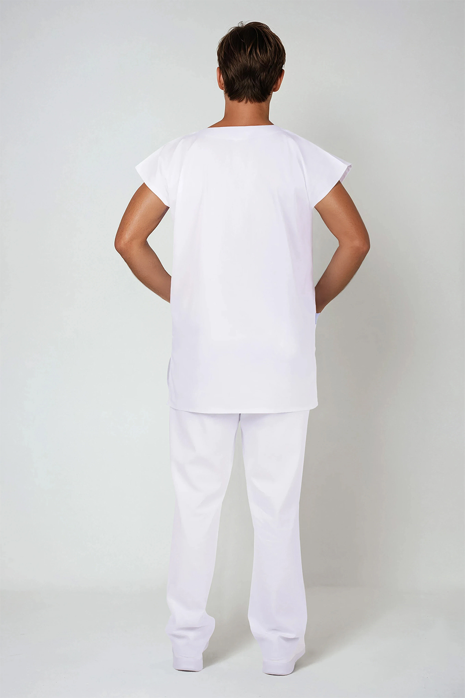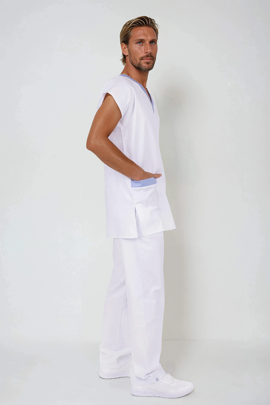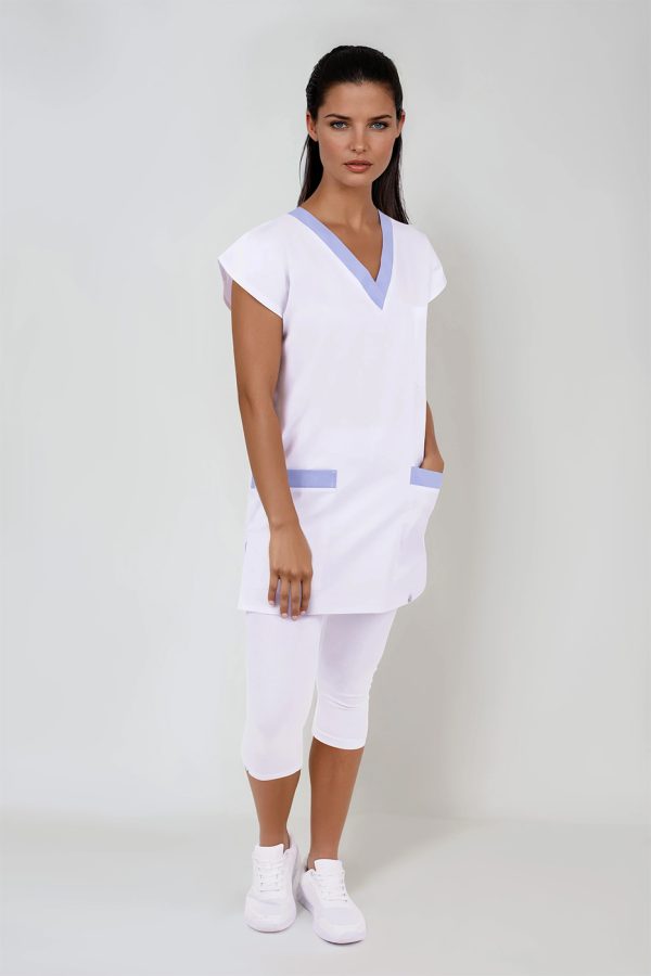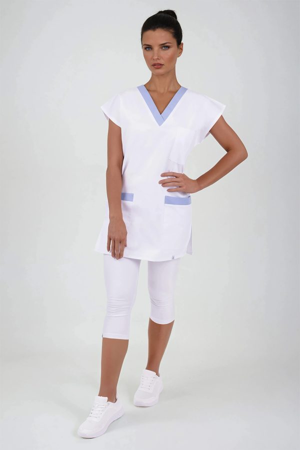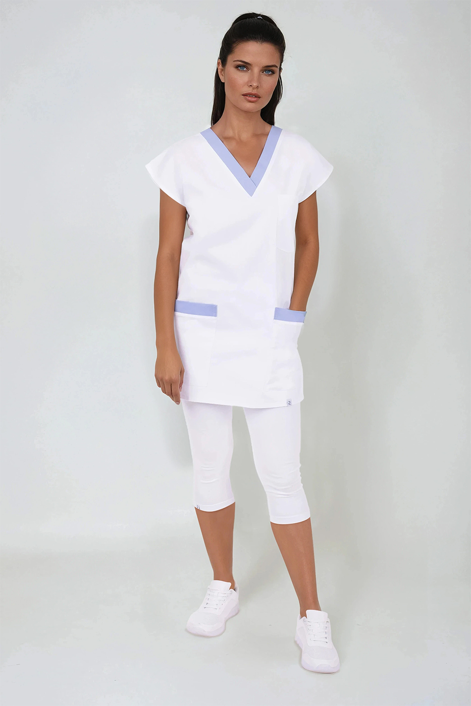 Design zdravotnické haleny vychází z osvědčeného střihu typu UNI – tedy unisex, který je vhodný pro ženy i muže. Střih je volnější a neomezuje v pohybu, což oceníte zejména při práci, která vyžaduje aktivitu, manipulaci s pacienty, nástroji nebo pohyb mezi odděleními. Krátké rukávy umožňují volnost pohybu rukou a zároveň splňují hygienické standardy.