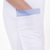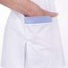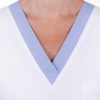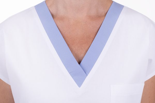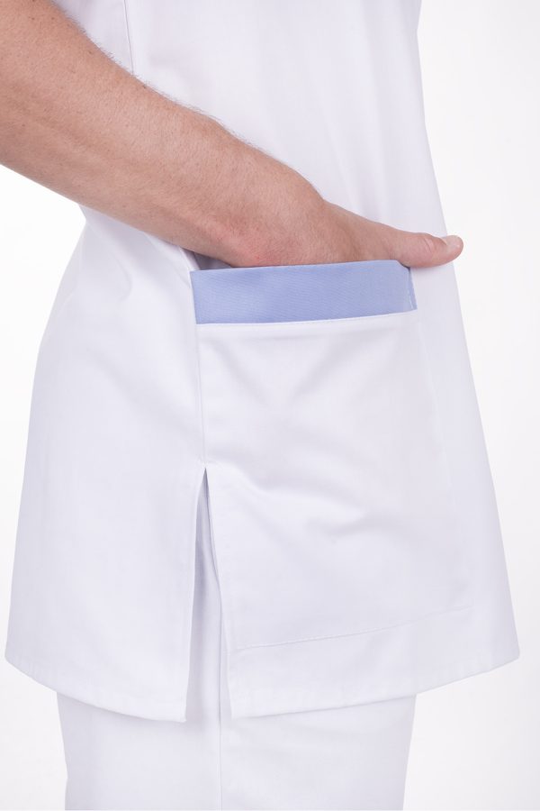 Výstřih do „V“ působí moderně a profesionálně, navíc opticky prodlužuje krk a odlehčuje vzhled. Dvě praktické spodní kapsy a jedna náprsní kapsa poskytují dostatek úložného prostoru pro nezbytnosti – od propisek přes telefon až po lékařské pomůcky, jako jsou fonendoskopy, kapesní zápisníky nebo jednorázové rukavice.