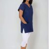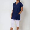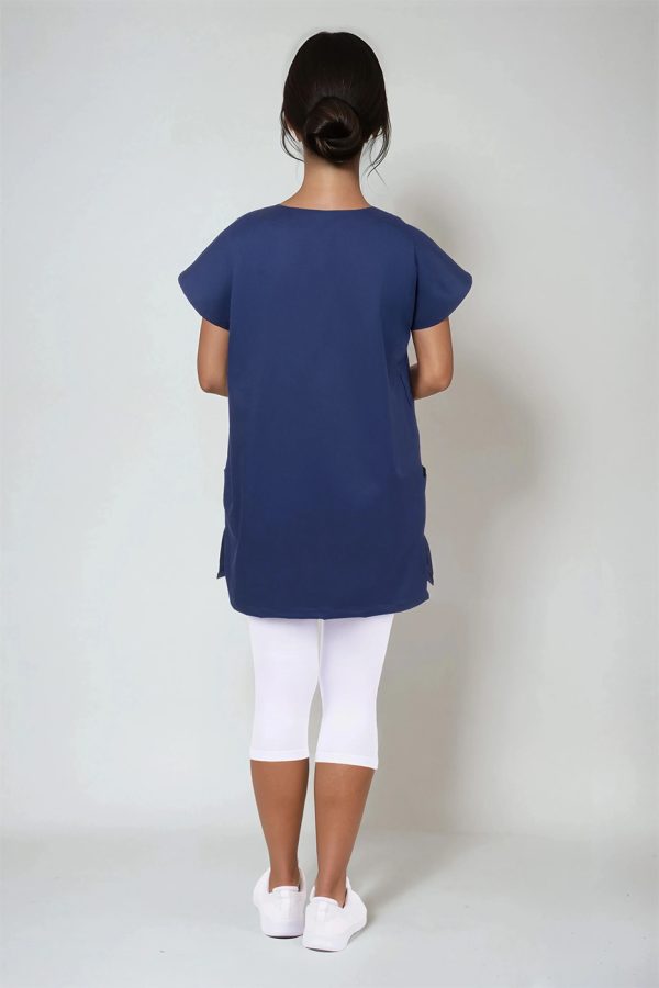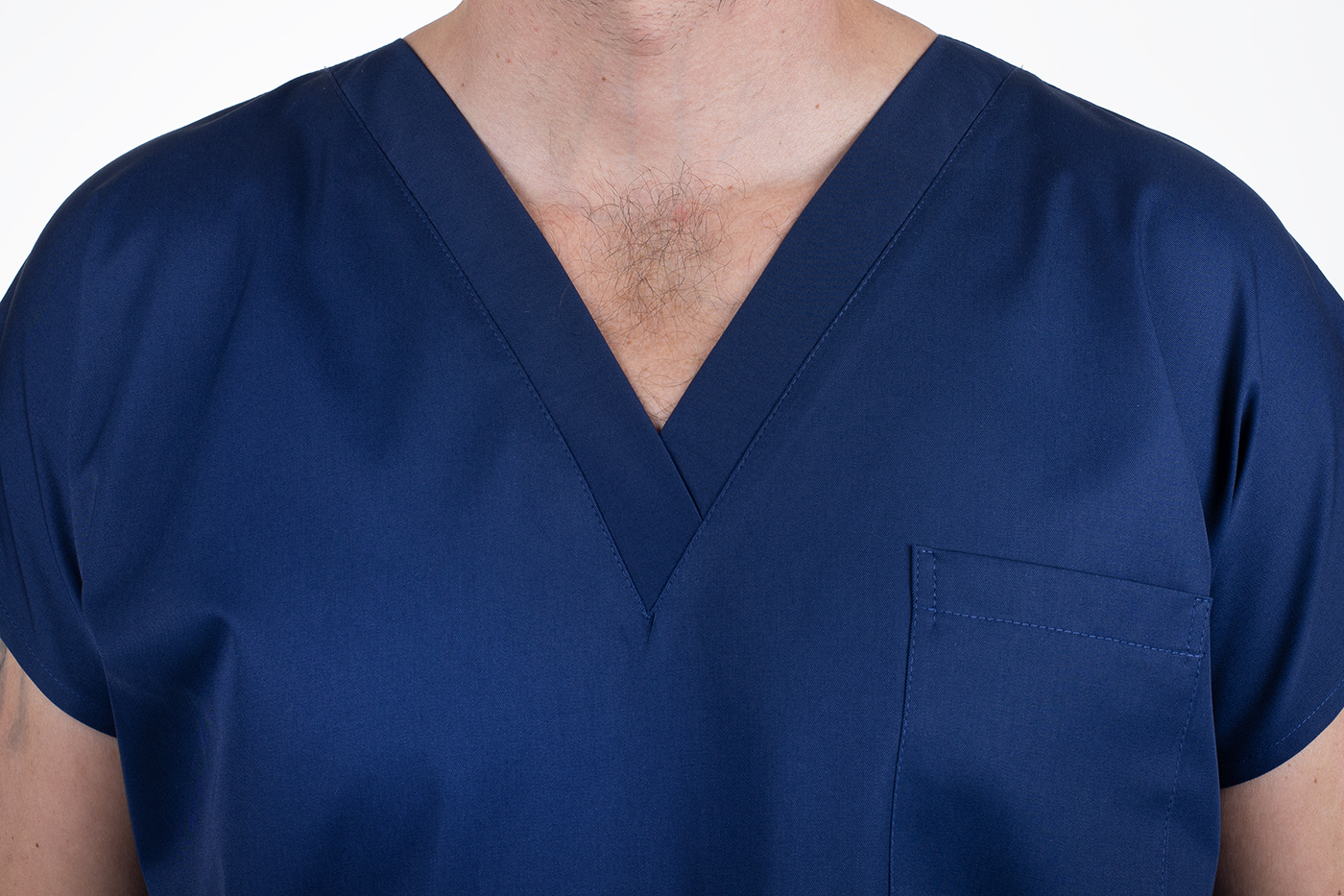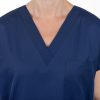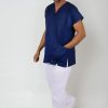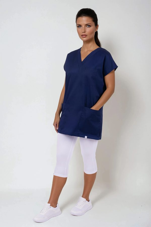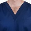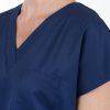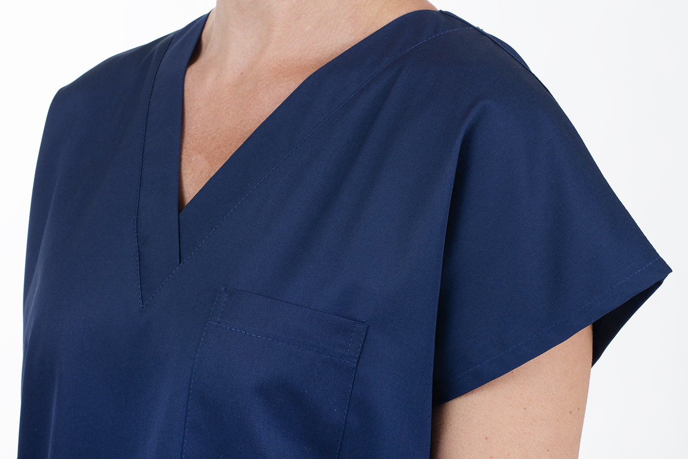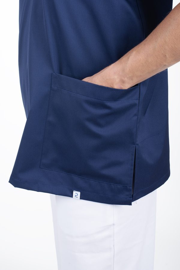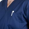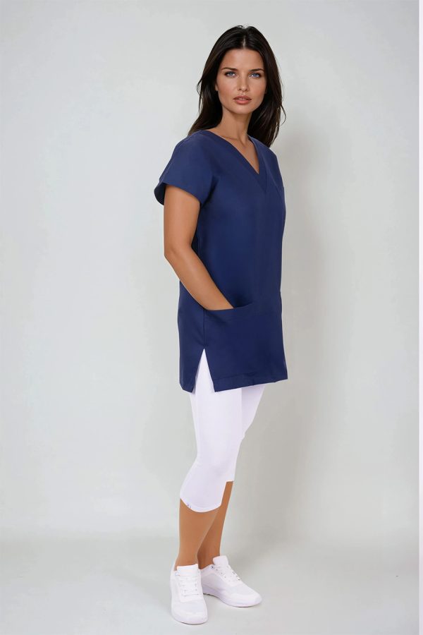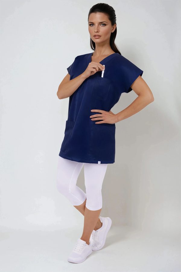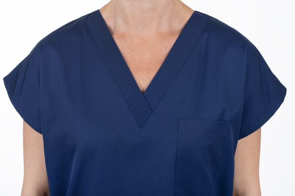 Výstřih do V usnadňuje oblékání přes hlavu – halena se tak rychle oblékne i svlékne, bez zbytečného zdržování. Zvláště v provozech, kde je nutná častá výměna oblečení (například mezi jednotlivými vyšetřeními nebo směnami), se tato vlastnost stává velkou výhodou.
