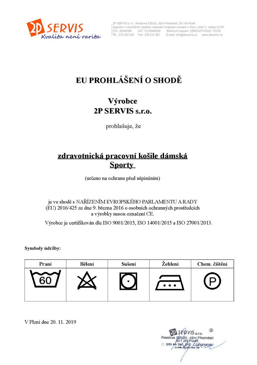 Zdravotnická pracovní košile dámská Sporty má pohodlný mírně vypasovaný střih, celopropínací zapínání na knoflíky, průkrčník zakončený límcem, 1 nakládanou kapsu na prsou a v bočním švu krátké rozparky. Materiál: 100% bavlna, sanfor., merc. 160g/m2. Praní: na 60°C.