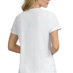 Zdravotnické haleny Becca v bílé barvě, s klasickým výstřihem do V, lehká tkanina odvádějící vlhkost, 4 kapsy včetně skryté kapsy na mobil s potiskem podšívky, pružná smyčka pro uchycení jmenovky, kontrastní potisk na spodní straně lemu krku, lehký strečový materiál, který není nutné žehlit, vícestehové prošívání ve švech pro delší životnost oděvu. Materiál: 95% polyester + 5% spandex. Praní: na 30°C.