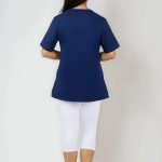 Zdravotnické haleny dámské Julia tmavě modrá s mírně vypasovaným střihem a praktickým oblékáním přes hlavu, které ještě navíc usnadňuje výstřih do V. Na předním díle sedlové členění a 3 nakládané kapsy, zadní díl hladký a dolní rovný kraj s krátkými bočními rozparky.