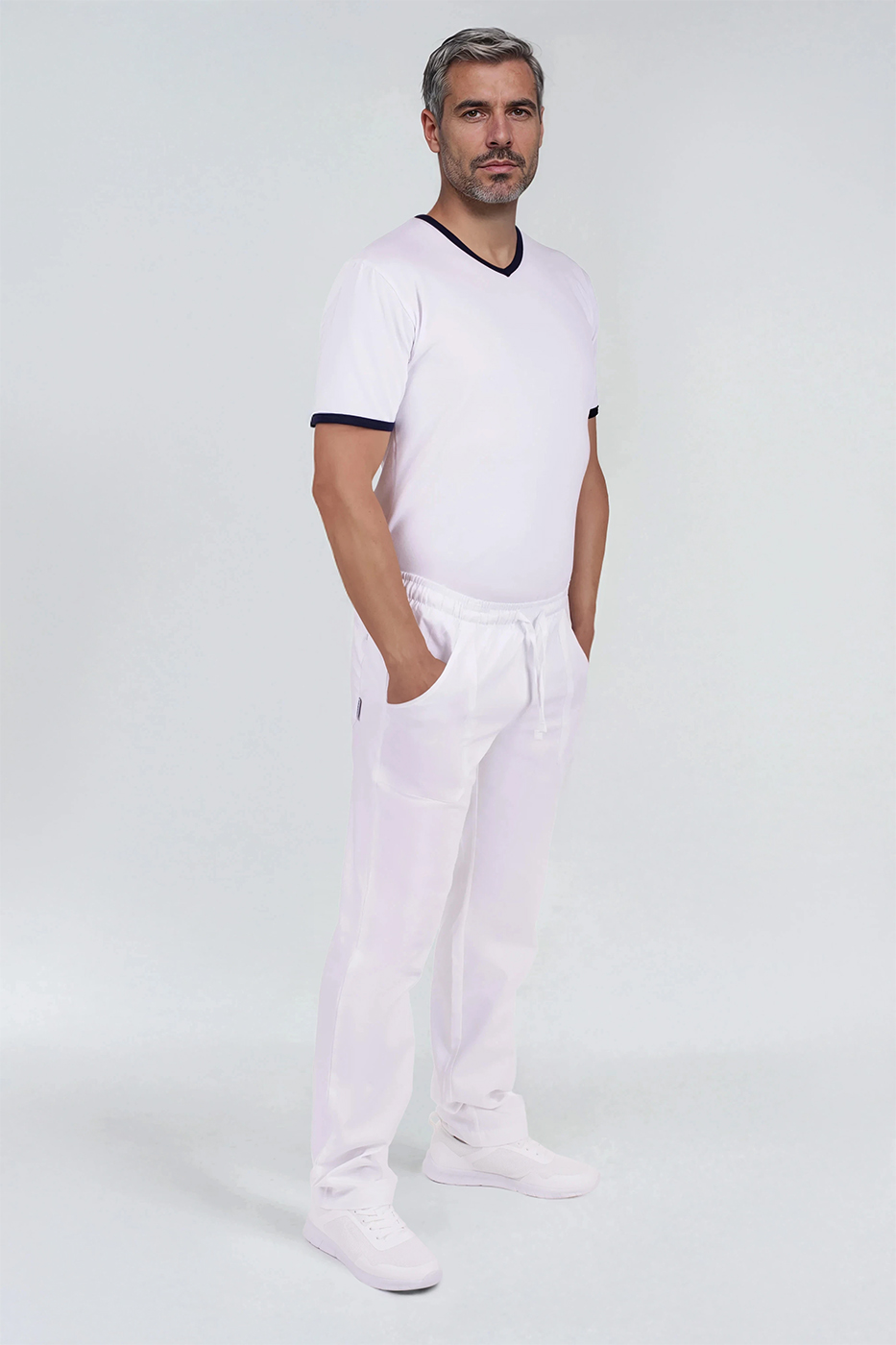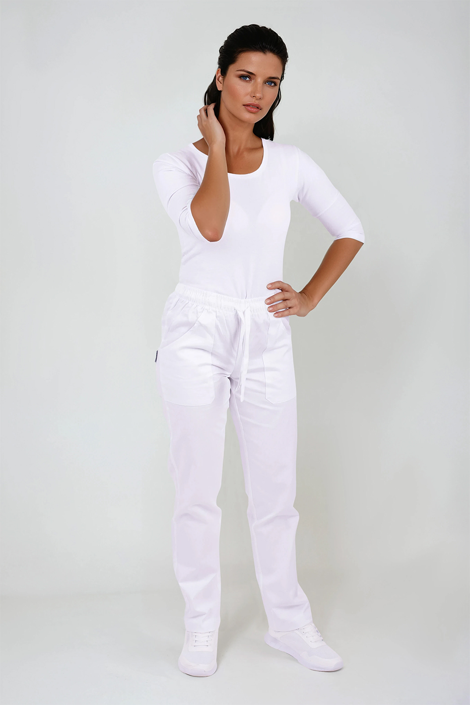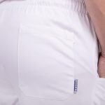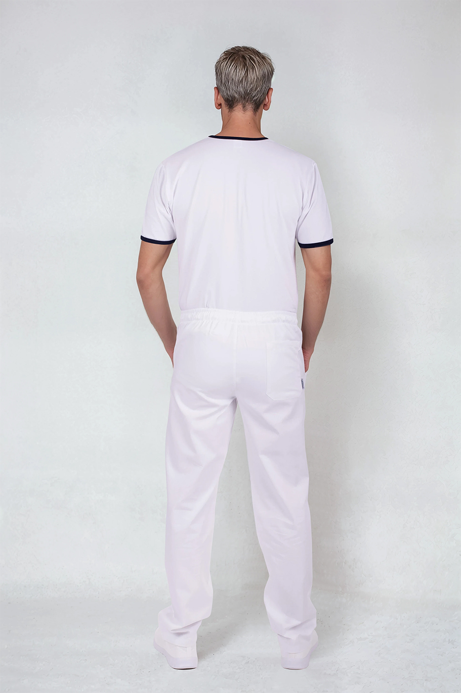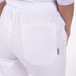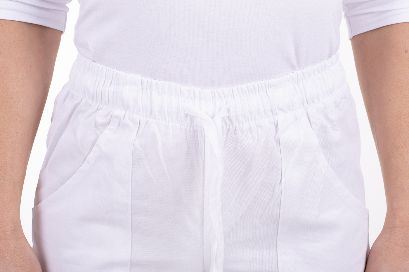 Zdravotnické kalhoty bílé Elastico Uni s gumou a šňůrkou v pase, 2 přední a 1 zadní kapsa. Materiál: 100% bavlna 190g/m2.