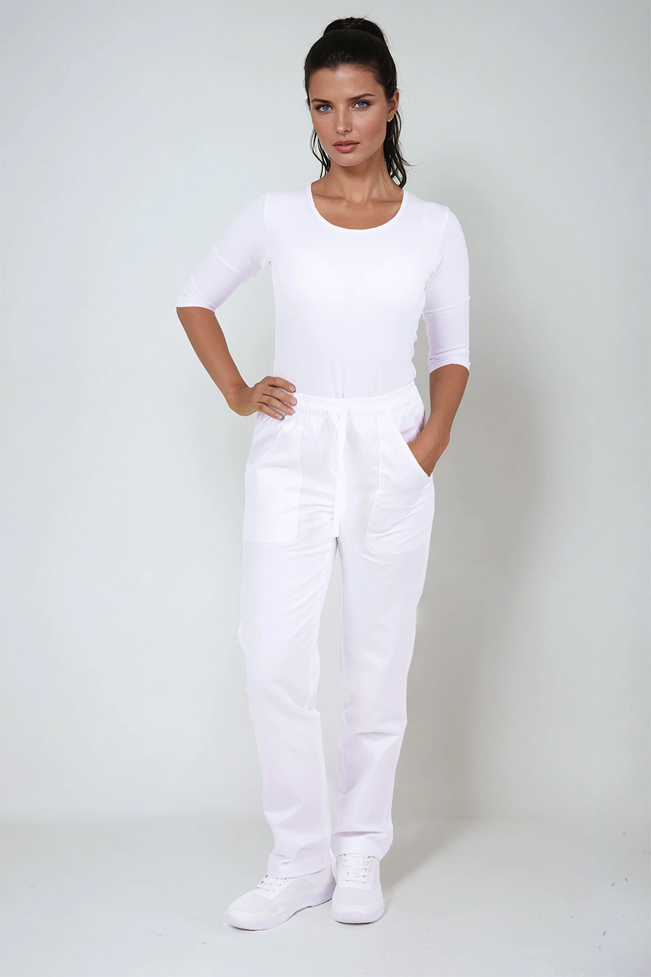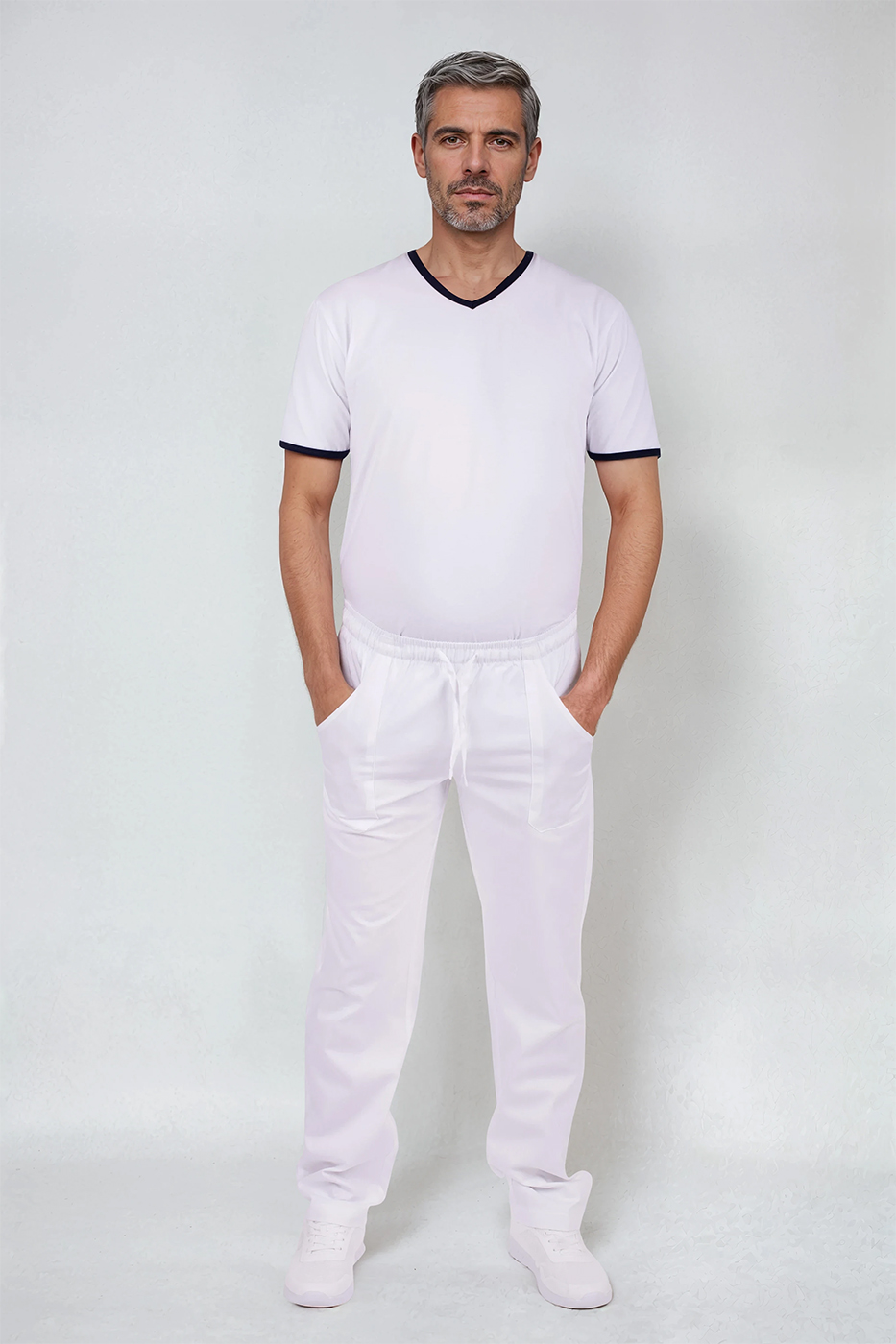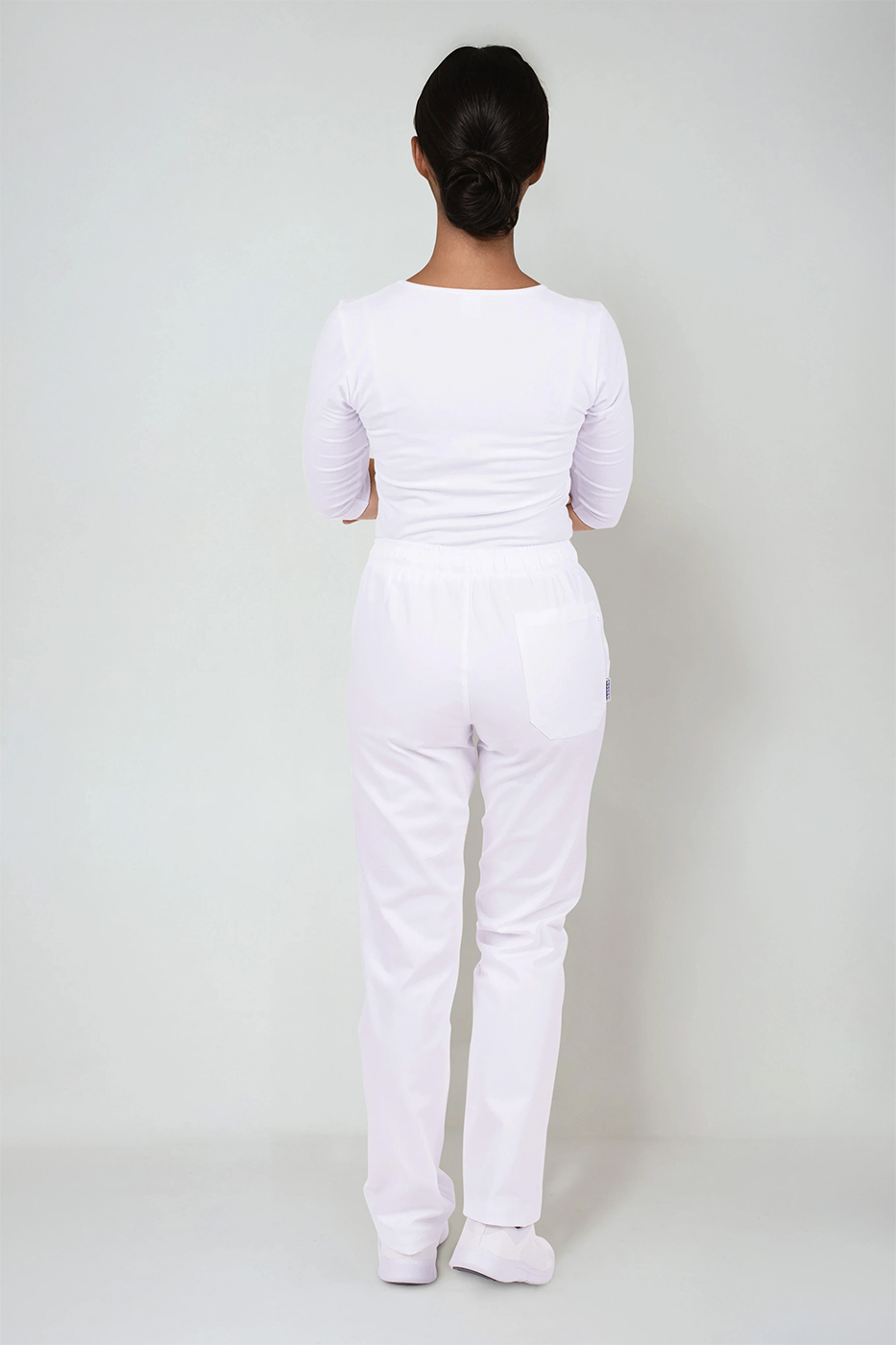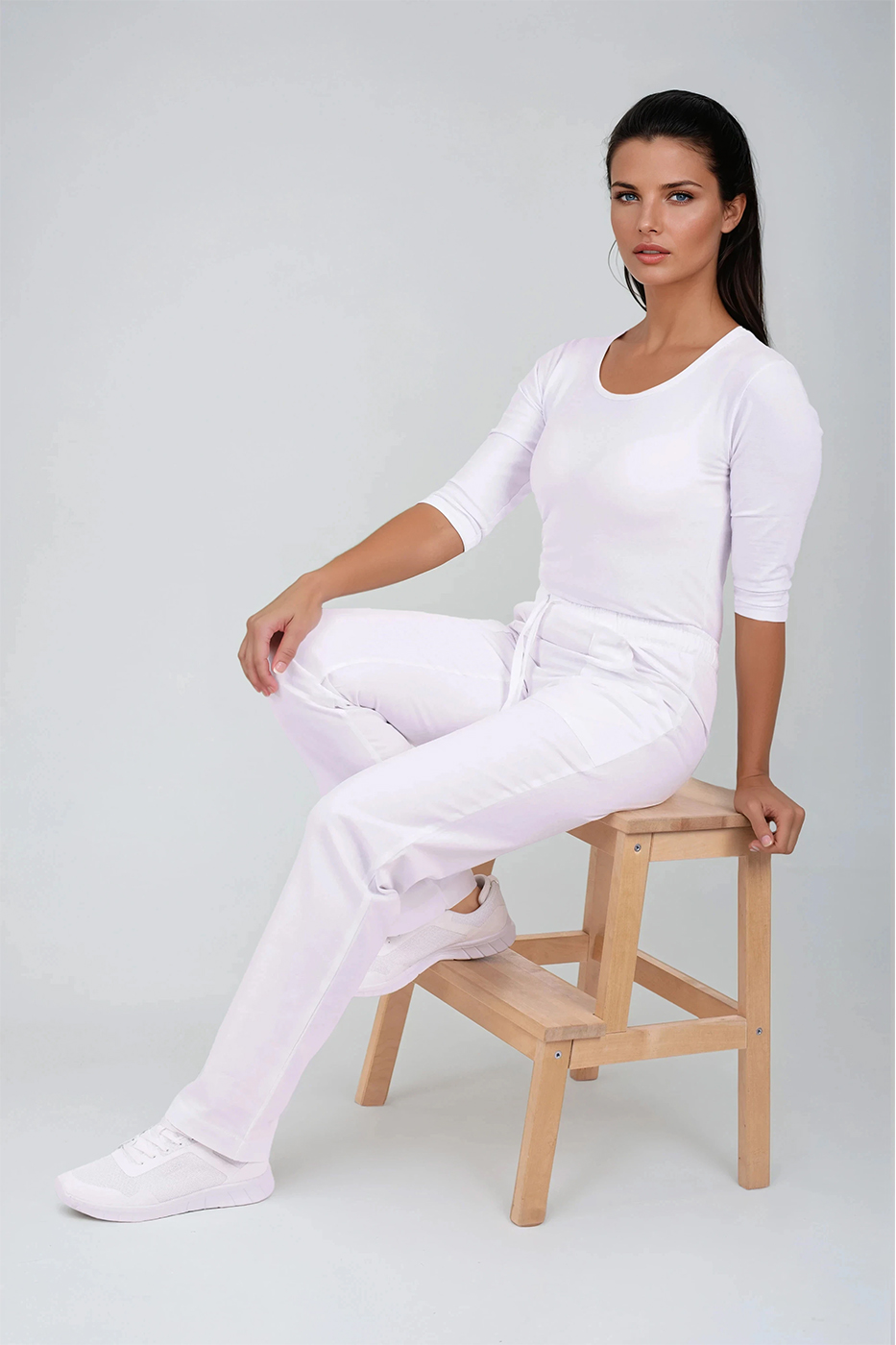 Zdravotnické kalhoty bílé Elastico Uni s gumou a šňůrkou v pase, 2 přední a 1 zadní kapsa. Materiál: 100% bavlna 190g/m2.
