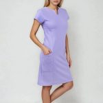 Zdravotnické šaty Linda fialové s mírně projmutým princesovvým střihem, který lichotivě kopíruje postavu. Výstřih je kulatý s decentním véčkovým rozparkem uprostřed. Krátké rukávy klasického střihu. 2 praktické a prostorné boční kapsy. Délka šatů je ke kolenům. Oblékání přes hlavu. Příjemný bavlněný materiál je strukturovaná pletenina s jemnou plastickou vazbou, velmi prodyšná a příjemná na dotek. Materiál: 100% bavlna pique. Praní: na 40°C.