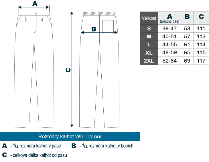Pánské pracovní kalhoty Willi Basic byly navrženy s ohledem na funkčnost a ergonomii. Kalhoty mají klasický střih s rovným zakončením nohavic, který neomezuje v pohybu a přizpůsobí se většině typů postav. V pase jsou osazeny pružným dílem a knoflíkem, který zajišťuje dobré držení bez zbytečného stahování nebo nutnosti pásku.