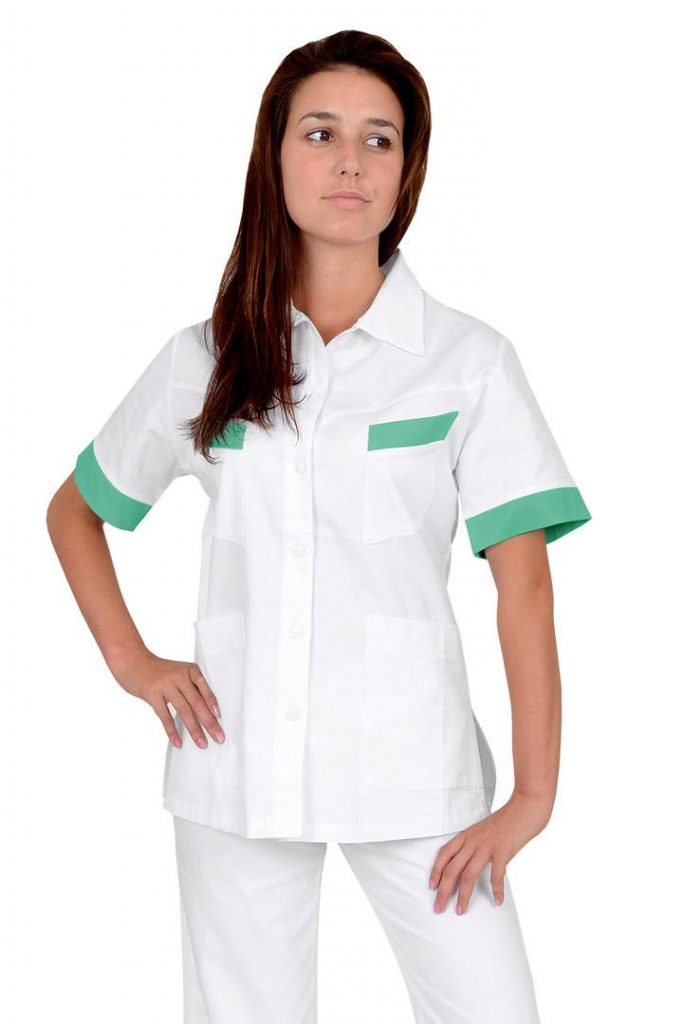 Zdravotnická pracovní halena dámská Lady s doplňky v barvě verbena má mírně vypasovaný střih s celopropínacím zapínáním na knoflíky, zdobená je barevnými lemy horních kapes a rukávů. Halenka má průkrčník zakončený límcem, zadní rovný díl, na předním díle 4 nakládané kapsy a v dolním kraji krátké boční rozparky. Materiál: 100% bavlna, sanfor., merc. 175g/m2. Praní: na 60°C.