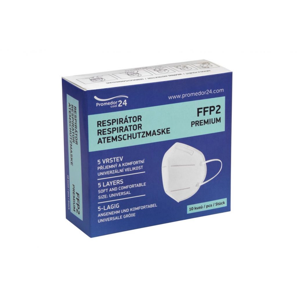 Respirátor FFP2 Premium PROM bez ventilu má 5 vrstev bavlny + netkané textilie meltblown + vrstva s aktivním uhlíkem. Účel použití respirátoru je zakrýt ústa a nos uživatele, aby se minimalizoval přímý přenos infekčních částic mezi uživatelem a osobami v jeho okolí (včetně pacientů). Respirátor dále slouží i k ochraně uživatele filtrací vdechovaného vzduchu s celkovou účinností převyšující 95%. Jedná se o zdravotnický prostředek dle směrnice 93/42/EHS a současně o osobní ochranný prostředek dle nařízení 2016/425. Výrobek je opatřen označením CE zaručujícím shodu s požadavky platných právních předpisů. Materiál: 5 vrstev bavlny + netkané textilie meltblown + vrstva s aktivním uhlíkem. Normy: EN 149:2001 +A1:2009, EN 14683 : 2019. Balení: 10 kusů v krabičce, baleno jednotlivě. Stupeň filtrace: ≥ 95%. Velikost: univerzální.